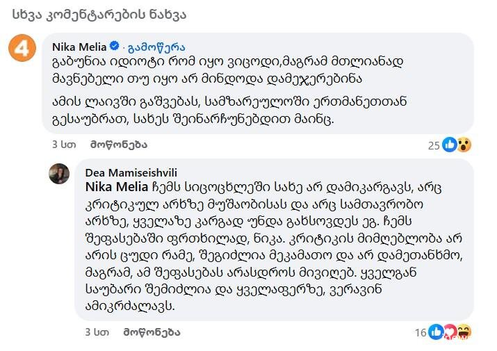 ნიკა მელია: "Dea Mamiseishvili ყველასთან საუბარი რომ შეგიძლია, ეგ სიტყვის თავისუფლების ნაწილია და ამ საუბრის შედეგად, რომ შენი შეფასების უფლება ასევე ყველას აქვს. სახე ანახეთ, რომელიც ჯობდა არ გენახებინათ, მავნებლობა გააკეთეთ და ახლა ამაზე კომენტარებიცა და შეფასებებიც აიტანეთ.