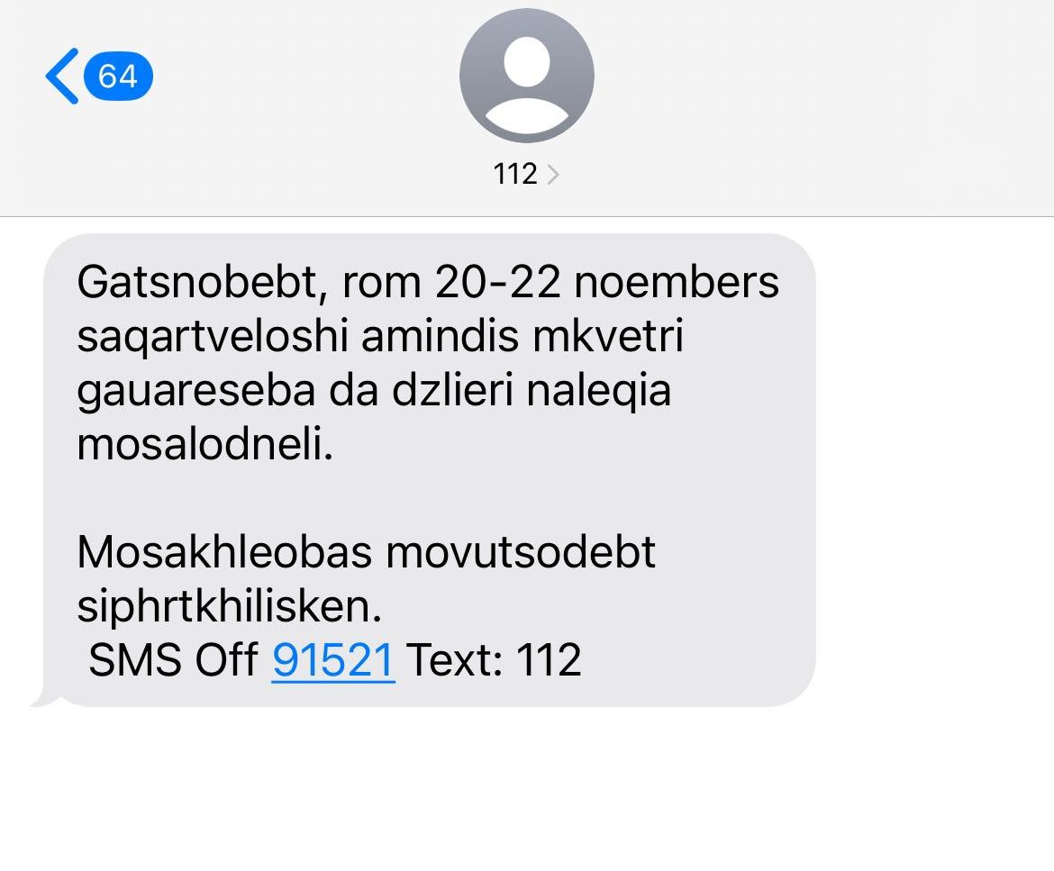 112 მოსახლეობას მოკლეტექსტურ შეტყობინებას უგზავნის, სადაც წერია, რომ უახლოეს დღეებში ნალექია მოსალოდნელი.