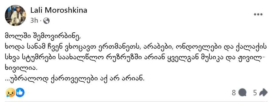 ლალი მოროშკინა სოციალურ ქსელში პოსტს აქვეყნებს.
