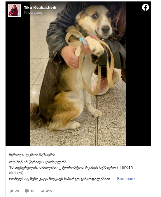 სოციალური ქსელის მომხმარებელი თიკო კვალიაშვილი 18 თებერვლის, თბილისი _ ტორონტოს რეისის მგზავრს მიმართავს და ძაღლის გადარჩენაში დახმარებას სთხოვს: