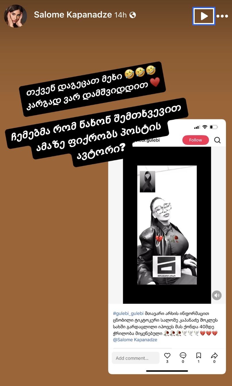 სოციალური ქსელის ერთ-ერთ გვერდზე გავრცელდა ინფორმაცია, რომ სალომე კაპანაძე საკუთარ სახლში მოკლეს. აღნიშნულს ინფლუენსერი სოციალურ ქსელში გამოეხმაურა.
