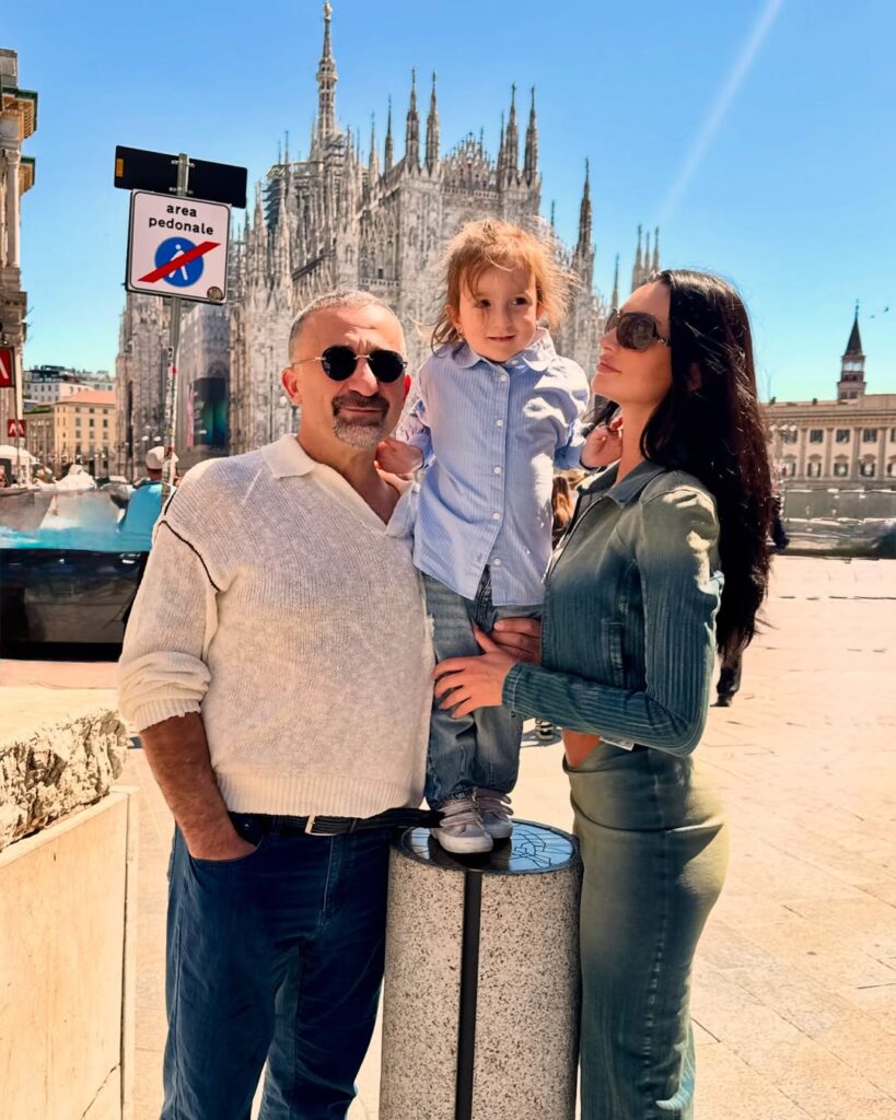 მოდელი ისტორიული შენობების ფონზე პოზირებს, მასთან ერთად იმყოფება მისი რჩეული დავით კოდუა და მათი პატარა ქალიშვილი.